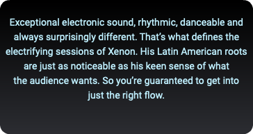 Exceptional electronic sound, rhythmic, danceable and always surprisingly different. That’s what defines the electrifying sessions of Xenon. His Latin American roots are just as noticeable as his keen sense of what the audience wants. So you’re guaranteed to get into just the right flow.