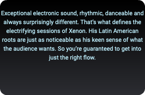 Exceptional electronic sound, rhythmic, danceable and always surprisingly different. That’s what defines the electrifying sessions of Xenon. His Latin American roots are just as noticeable as his keen sense of what the audience wants. So you’re guaranteed to get into just the right flow.